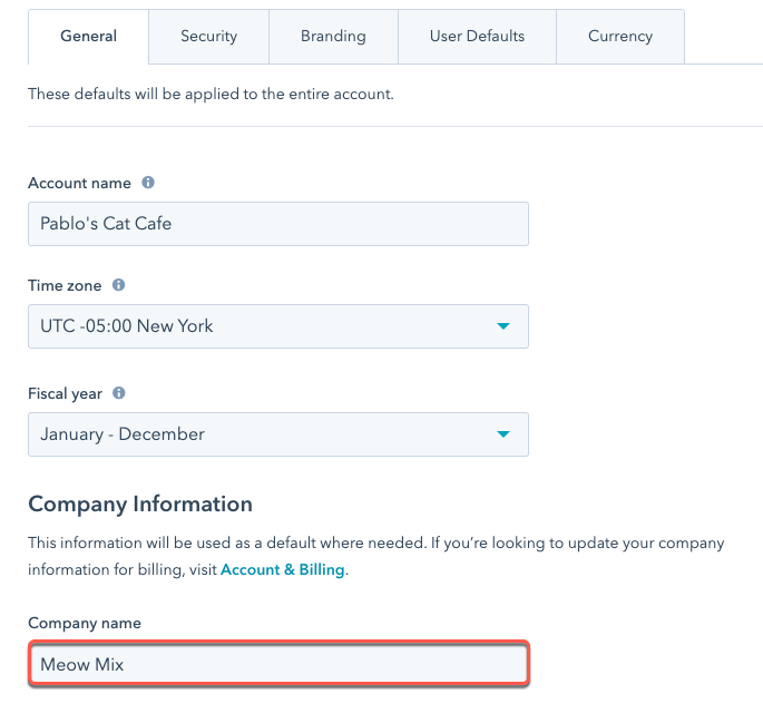 If you have Edit account defaults permissions, you can customize the company logo, default colors, and company information that display on meetings links, sales documents, quotes, chatflows, and other HubSpot content.