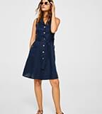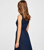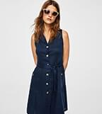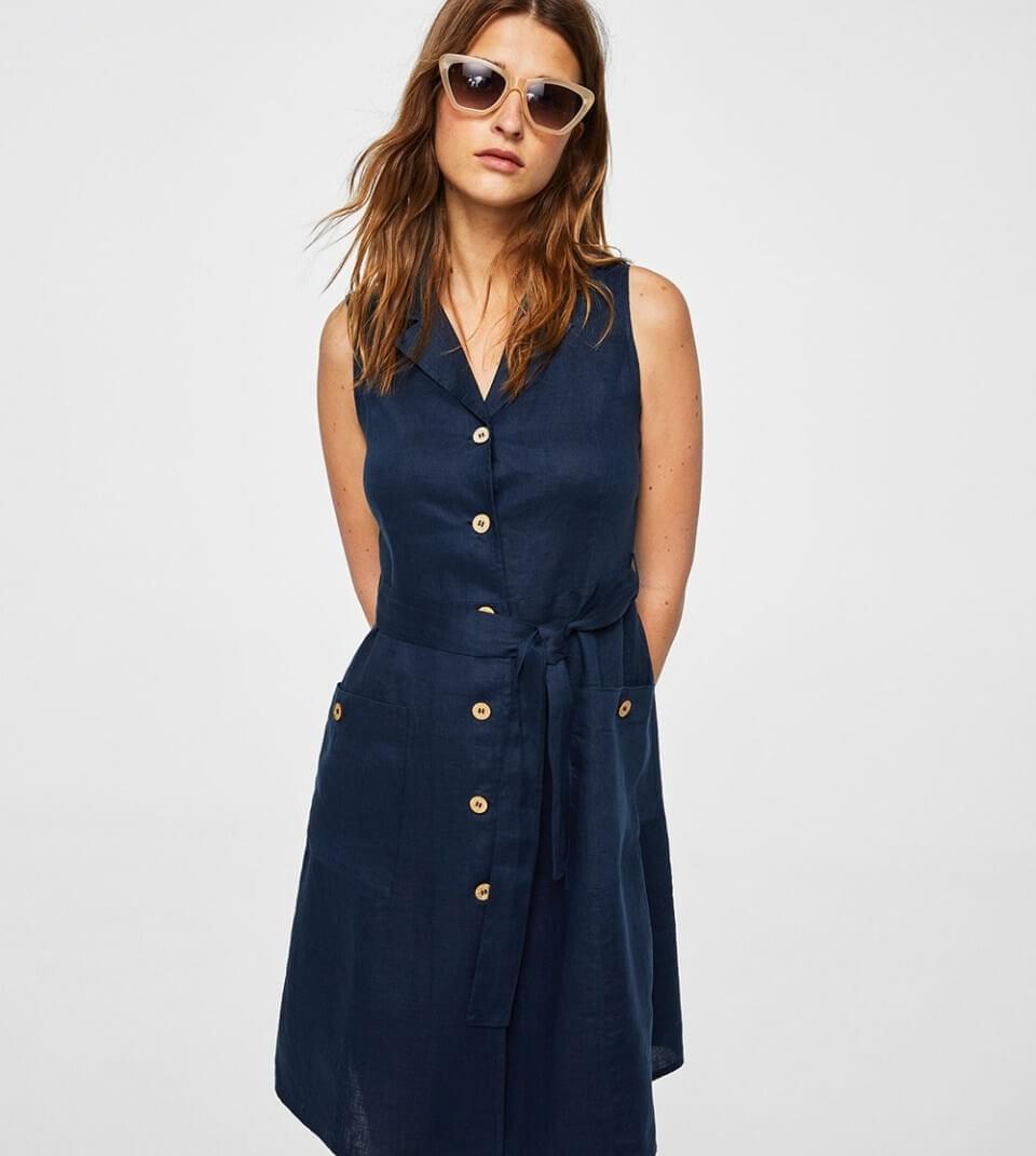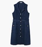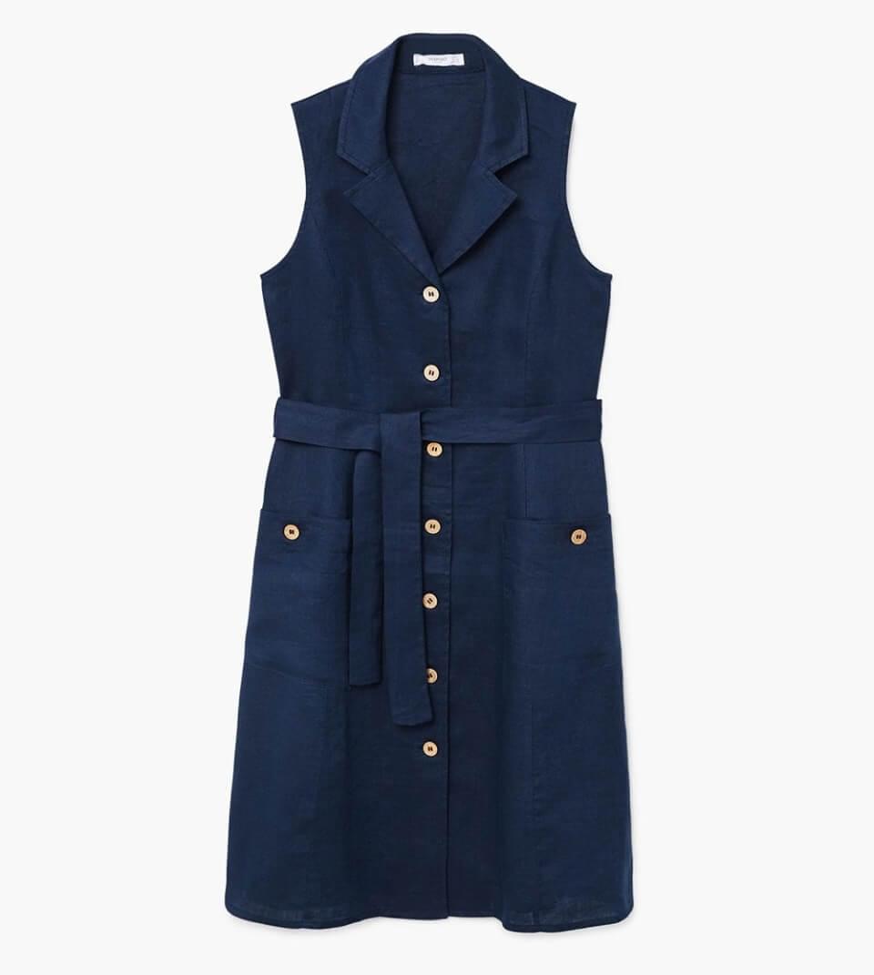 Linen and cotton mix. Straight design. Classic collar. Sleeveless. Removable belt at the waist. Two patch pockets on the front. Button fastening on the front section.